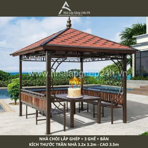 Trong xu hướng thiết kế cảnh quan hiện đại, những mẫu nhà chòi sân vườn không chỉ đóng vai trò che nắng che mưa mà còn là điểm nhấn thẩm mỹ nâng tầm không gian sống. Mẫu chòi lắp ghép tứ giác mái ngói Bitum với kích thước 3.2 x 3.2m, cao 3.5m là lựa chọn hoàn hảo cho những ai đang tìm kiếm một không gian thư giãn sang trọng, bền bỉ và dễ thi công.
